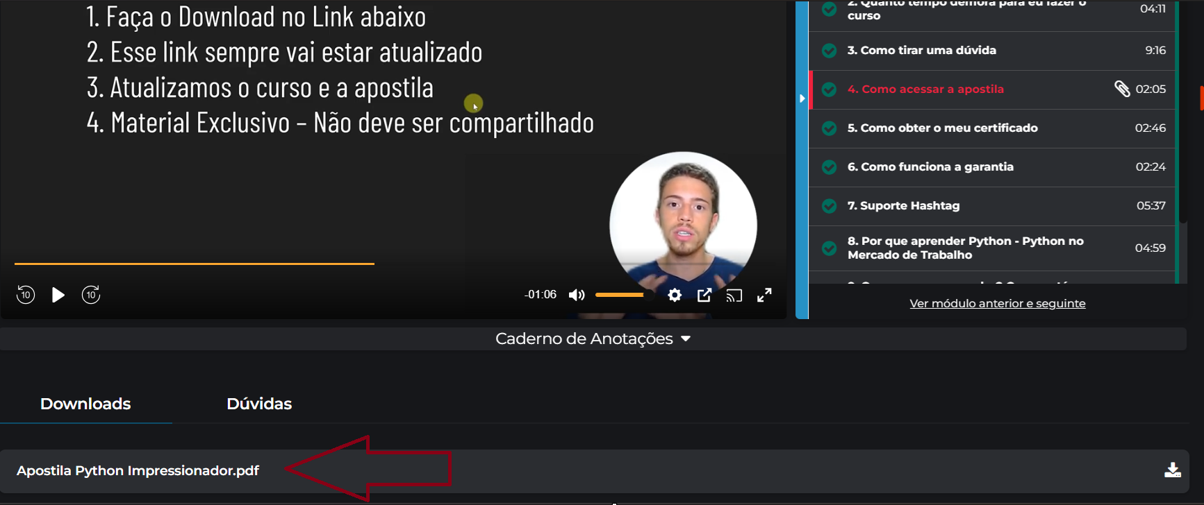 Logo abaixo do Player do vídeo correspondente, você vai encontrar um link para download em formato PDF para baixar em seu dispositivo.