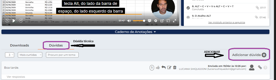 Em cada aula, você encontra a área de dúvidas abaixo do vídeo, onde também terá acesso às dúvidas de outros alunos, que podem coincidir com sua. 😉