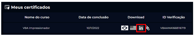 Na nova página, procure pelo curso que gostaria de emitir o certificado, e clique na opção com o ícone do LinkedIn, como na imagem abaixo: