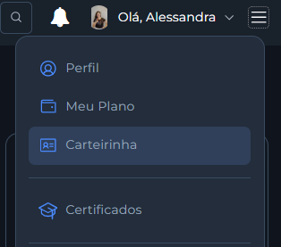 Para verificar se você já atendeu a essas condições, é só acessar a área de "Carteirinha" no menu suspenso, ao lado do seu nome, conforme mostrado na imagem abaixo.