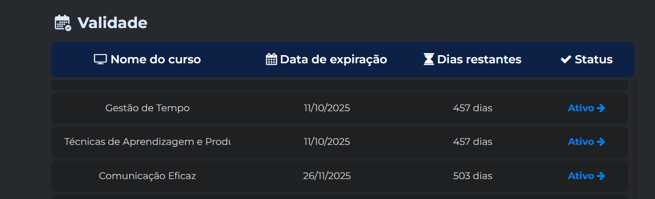 - A data de expiração do seu curso também estará disponível na mesma seção ou em uma subseção específica.