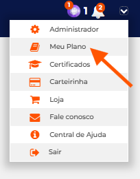 - No canto superior direito da página, clique na seta branca que aponta para baixo. Irá aparecer um menu e você irá clicar em "meu plano" conforme a imagem abaixo: