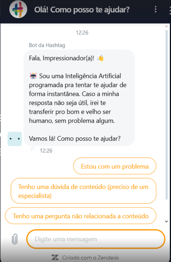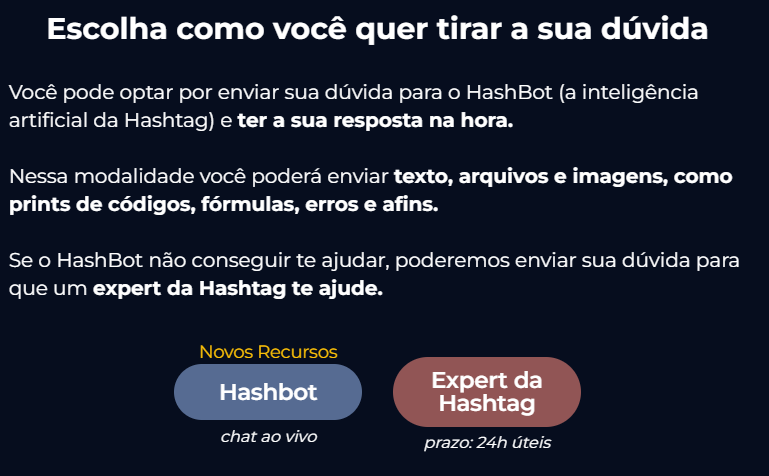 Além do Hashbot e do HashGPT, a plataforma possui um Bot da Hashtag, acessível diretamente na tela inicial. Esse assistente virtual interage com os usuários de maneira prática, fornecendo suporte rápido sobre a plataforma e direcionando dúvidas para os canais corretos. Para acessá-lo, basta clicar no ícone localizado no canto inferior direito da tela.